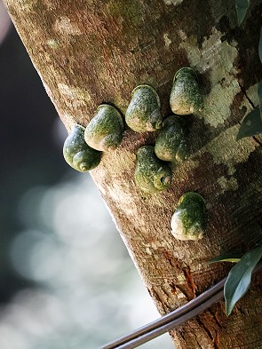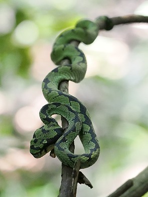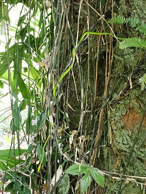 Da ich nur auf einem Auge gut sehen kann und nur zweidimensional gucke, ist so ein Wanderweg doppelt anstrengend. Während wir uns mühsam die Hänge hinaufarbeitet haben und die feucht-warme Luft das Atmen erschwert, offenbart der Wald seine einzigartige Fauna. In der niedrigen Vegetation oder auf moosbedeckten Felsen lässt sich die Ceylon-Lanzenotter (Trimeresurus trigonocephalus) entdecken. Ohne Pranbath hätten wir die gut getarnten Tiere wohl sicher übersehen, aber er wusste, dass wir Schlangen gut finden und hat mehrere gefunden.