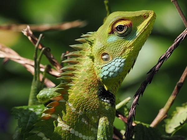 Bei der Weiterfahrt entdeckte Prabath aus den Augenwinklen dann noch prächtige Tiere im Gras: Die hübsche Gartenagame (Calotes versicolor) ist in der Lage, ihre Körperfarbe zu ändern. Diese Fähigkeit ist jedoch nicht so extrem ausgeprägt wie bei Chamäleons und dient primär der Kommunikation und Thermoregulation, weniger der Tarnung.