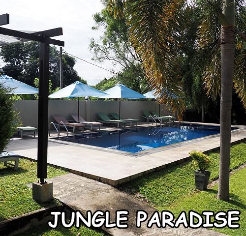 Nach dem Besuch in Yala wollten wir von der nächsten Unterkunft aus noch eine Safari im Udawalawe-Nationalpark unternehmen, um Elefanten zu sehen. Außerdem war ein Ruhetag geplant, weshalb uns ein schönes Hotel mit Pool gerade recht kam: das Jungle Paradise. Es handelt sich um ein hochbewertetes Boutique-Hotel, das für seine idyllische Lage inmitten der Natur und die Nähe zum Nationalpark bekannt ist. Da das Hotel sehr beliebt ist und nur über eine begrenzte Anzahl an Zimmern verfügt, empfiehlt sich eine frühzeitige Buchung.