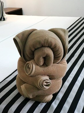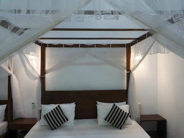 In dem großen Bett mit Moskitonetz haben wir sehr gut geschlafen, und auf dem dritten Bett konnten wir unsere Kleidung ausbreiten. Das war sehr praktisch, da es weder einen Kleiderschrank noch Kleiderbügel gab. In einer Ecke konnte man sich Tee und Kaffee zubereiten, zudem stand dort eine große Flasche mit Spritzaufsatz und Citronella-Öl gegen die Moskitos bereit. Es gibt einen kleinen Kühlschrank und einen Safe.