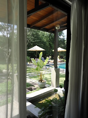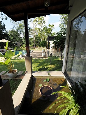 Wir bewohnten das erste der drei Zimmer, die in einer Reihe vom Pool und Restaurant aus angeordnet sind. Es ist sehr großzügig geschnitten, gut klimatisiert und verfügt über eine Terrasse mit Blick in den grünen Garten sowie zum Pool. Auf den Terrassen befinden sich kleine Wasserbecken mit blühenden Pflanzen, die gerne von Fröschen und Echsen besucht werden.