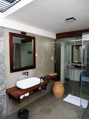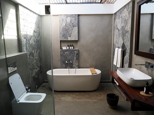 Neben der Toilette, der gläsernen Dusche und dem Waschbecken mit umlaufender Ablage steht hier eine wunderbare Badewanne. Wie fast überall in Sri Lanka führt auch hier eine kleine Stufe hinauf, auf die man achten sollte. Ökologisch hochwertiges Badesalz, Shampoo, Conditioner und Duschgel stehen in Glasflaschen zur Verfügung, und ein Föhn ist natürlich ebenfalls vorhanden.