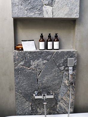 Das stilvolle Badezimmer mit Regendusche bietet ebenfalls viel Platz. Da die gläserne Abtrennung sehr unauffällig ist, sollte man die Schiebetür zum Bad stets bewusst wahrnehmen. Nachdem wir anfangs einige Male dagegen gelaufen sind, haben wir uns schnell daran gewöhnt.