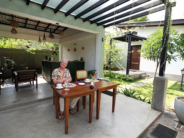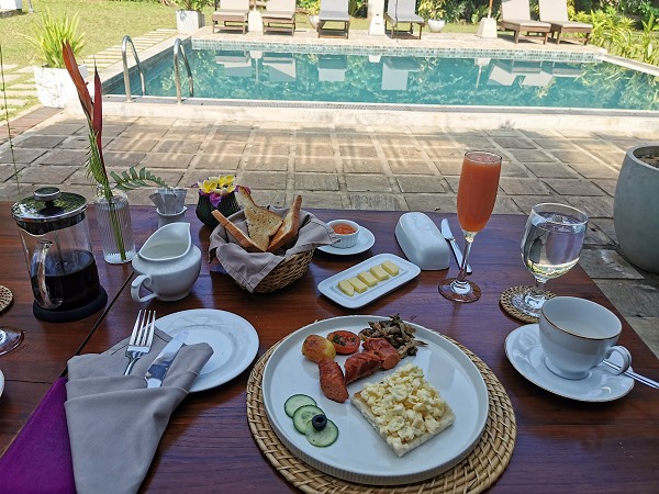 Das Frühstück muss man am Vorabend bestellen, wobei eine Auswahl aus zwei Getränken besteht: Fruchtsaft sowie eine Variante mit Porridge, den wir beide nicht mögen. Dazu gibt es Früchte, Toast mit Butter und Marmelade sowie beim westlichen Frühstück Eier nach Wahl mit gegrillter Tomate, Speck und Würstchen. Letzteres kann man durch ein srilankisches Frühstück ersetzen, hier wurden jedoch lediglich String Hoppers und Bananen-Pfannkuchen mit Kithul-Sirup angeboten.