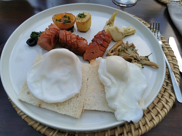 Am ersten Morgen bestellten wir pochierte Eier, die jedoch etwas misslungen serviert wurden, da sie fast hart waren. Zudem lagen auf dem Teller noch ein paar Streifen Artischocken und gebratene Pilze. Da mir etwas Süßes fehlte, erhielt ich am Ende sogar noch einen kleinen zusätzlichen Pfannkuchen.
