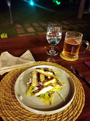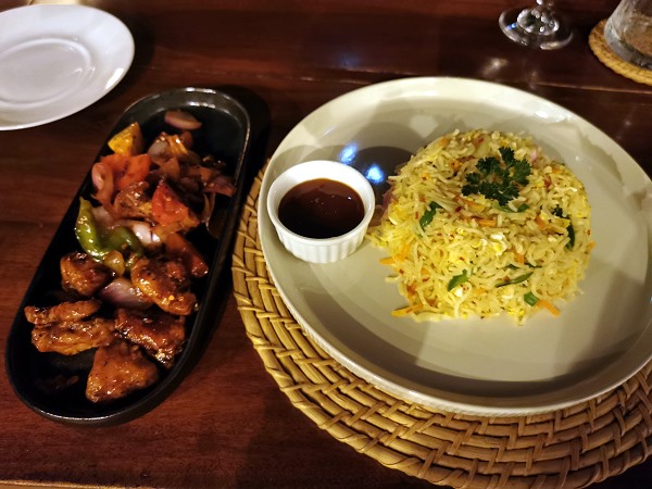 Am ersten Abend wählten wir einen Grilled Chicken Salad (1.800 LKR). Michael entschied sich für Devilled Chicken mit Knoblauchreis (3.150 LKR), während ich ein wunderbares und leckeres vegetarisches Pittu (2.650 LKR) genoss. Zum Nachtisch wählte Michael den Klassiker Curd mit Treacle, der hier mit stolzen 1.150 LKR auf der Karte stand, und ich bestellte für 1.200 LKR ein Watalappam. Alles war sehr lecker und man bemüht sich hier etwas Besonderes zu bieten.