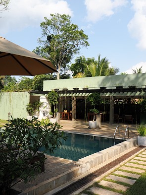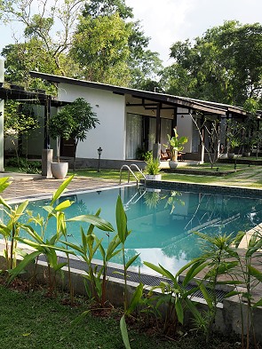 Inmitten der Gartenanlage befindet sich ein gepflegter Außenpool, der zur Entspannung und Abkühlung nach Besichtigungstouren einlädt. Das haben wir auch gebraucht, denn nach vielen Regentagen und Wolken im Hochland und in Sigiriya schien hier wieder erbarmungslos die Sonne vom blauen Himmel.